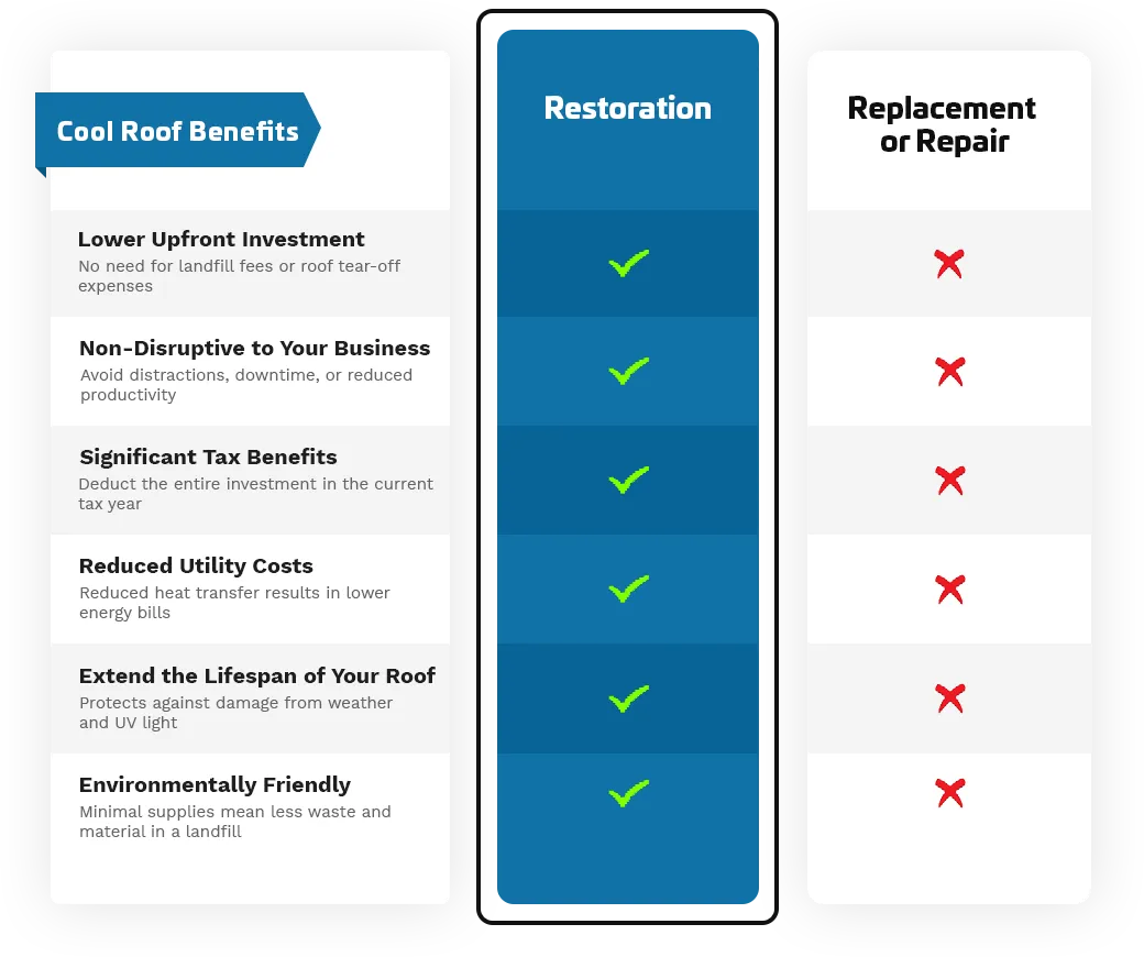 Commercial Roof Restoration can be performed on most traditional roof substrates. Tear-off, land-fill fees, reconstruction, and long facility disruptions are eliminated.